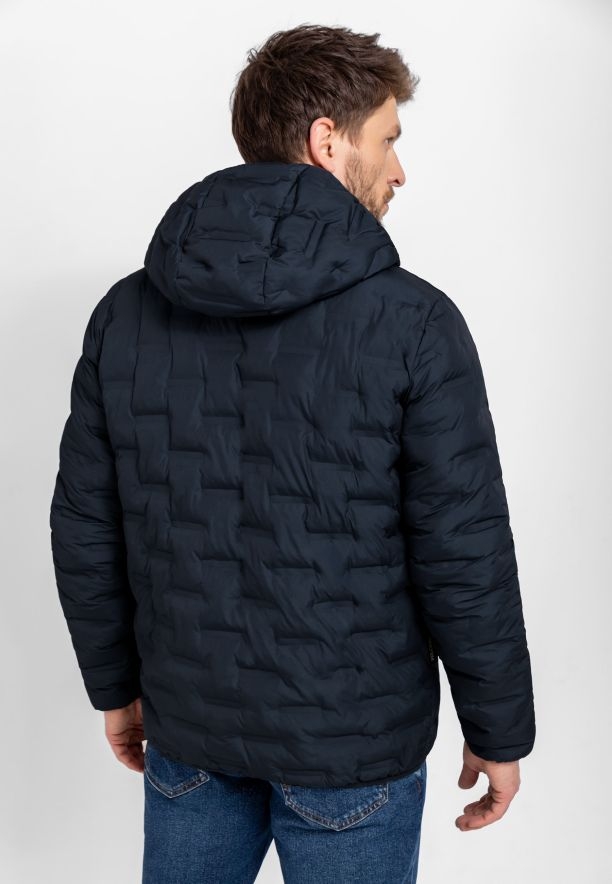 Tmavě modrá prošívaná bunda s kapucí je vynikající volbou pro chladné dny! Její prošívání a lehká konstrukce zajišťují optimální teplo, a navíc charakteristické vodorovné prošívání, tvořící nepravidelné, geometrické vzory, jí dodává dynamický a svěží vzhled, odlišující ji od tradičních péřových bund. Přechodná bunda je vybavena praktickou, odnímatelnou kapucí, která účinně chrání před větrem a deštěm, a také dvěma diskrétně začleněnými kapsami se zapínáním na zipy, ideálními pro uložení drobných předmětů nebo zahřátí rukou. Spodní lem bundy a manžety jsou zakončené elastickou lemovkou, což zabraňuje profouknutí a pomáhá udržet teplo.