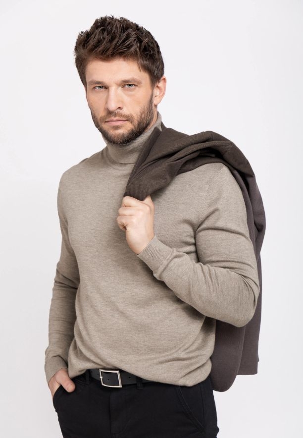 Béžový pánský rolák S-MAX má klasický střih a vyznačuje se minimalistickým designem. Protože je ušitý z lehké pleteniny s klasickou vazbou, osvědčí se jak na podzim, v zimě, tak i na jaře v chladnější den. Pletenina je měkká a příjemná na dotek, což zvyšuje komfort nošení.
