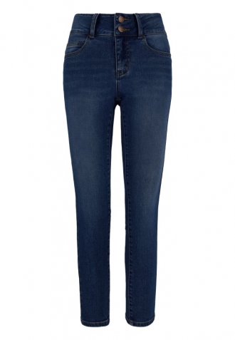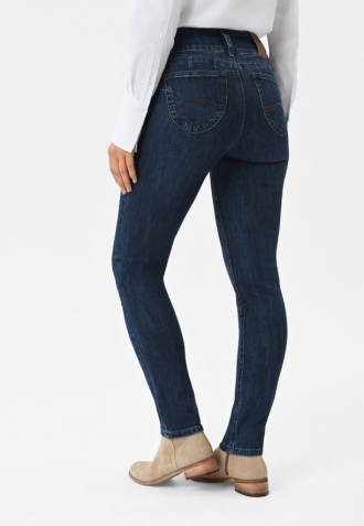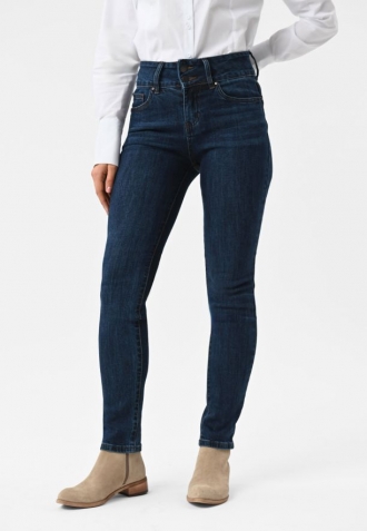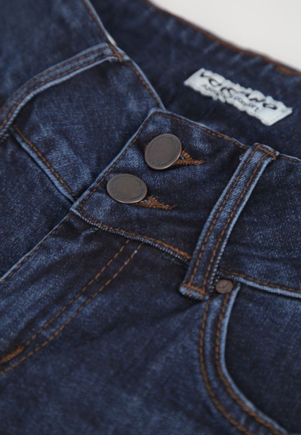 Netypickým řešením u tohoto modelu je systém zapínání na dva horní knoflíky a zip. To vytváří ozdobný efekt a zároveň drží břicho „na místě“. Přestože džínové kalhoty přiléhají k postavě, neomezují v pohybu. Děje se tak proto, že jsou ušity z materiálu s přídavkem elastanu.