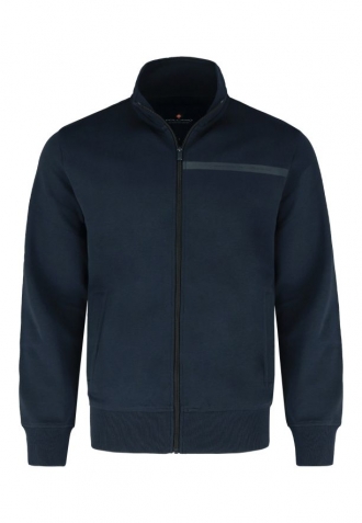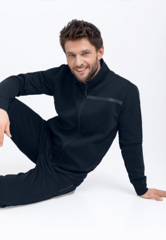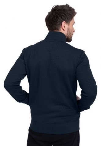Stylová pánská mikina B-LUNOS - rozepínací a se stojáčkem je návrhem pro ty, kteří si cení sportovní elegance a funkčnosti v jednom. Vyrobena z měkké, avšak odolné pleteniny — směsi polyesteru, viskózy a elastanu — zajišťuje ideální rovnováhu mezi přirozenou prodyšností a pružností, která se přizpůsobí postavě. Vysoký stojáček chrání před větrem a dodává moderní charakter, a subtilní, pogumovaný pásek na hrudi přerušuje tmavě modrou barvu, zdůrazňujíc minimalistický design. Střih regular s praktickým zipem po celé délce a diskrétními bočními kapsami zajišťuje, že mikina skvěle sedí jak v každodenních, tak i sportovních stylizacích.