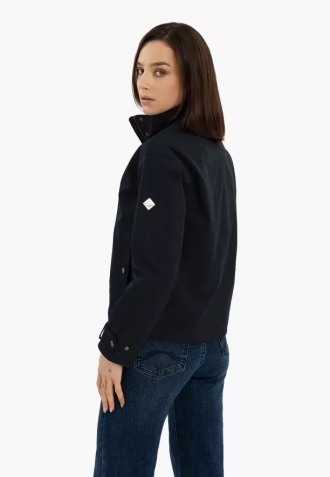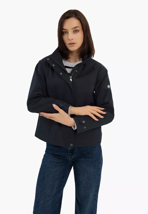 Krátká dámská bunda J-MELBA je kvintesencí sportovní elegance. Má ležérní stojáček a elegantní kovový zip, který je diskrétně skryt pod légiou na druky. Její rovný, volný střih lze upravit pomocí vnitřní stahovací šňůrky ve spodní části. V takovém případě získáme uvolněnou, lehce podkasanou bundu. Celek doplňuje jemný odstín béžové, který podtrhuje klasický střih a univerzálnost bundy. Právě tato nadčasovost a praktické detaily umožňují její snadné kombinování jak s elegantními prvky, tak s typicky ležérními kousky. Lehká, tmavě modrá bunda J-MELBA je ideální volbou pro proměnlivé březnové nebo dubnové počasí.