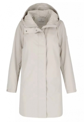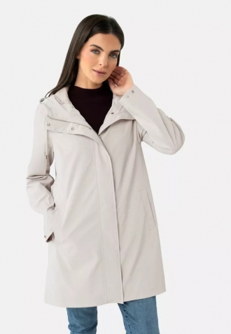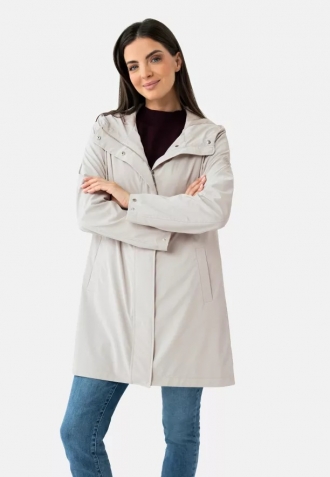 Elegantní, lehký kabát s moderním a nadčasovým střihem je ideální volbou pro přechodné období. Je vyroben z odolného materiálu, který chrání před větrem a chladem, a zároveň zajišťuje pohodlí při celodenním nošení. Materiál je hladký a má krémovou barvu. Rovný střih s volným spodním lemem skvěle sedí na postavě, neomezuje v pohybu a praktická kapuce se šňůrkami, diskrétní zapínání na zip a funkční kapsy podtrhují jeho univerzální a městský charakter.