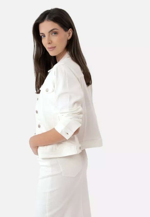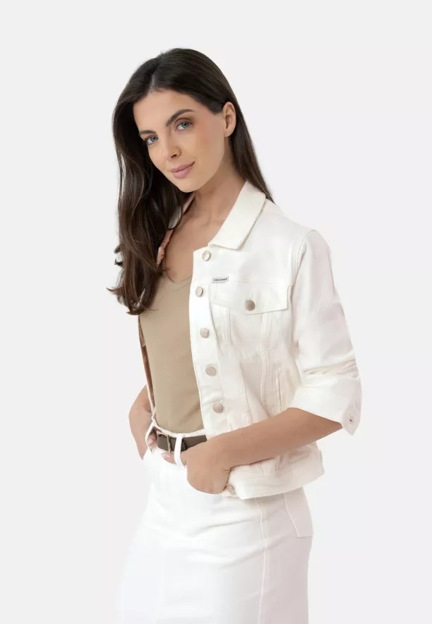Klasická dámská džínová bunda v novém provedení. Bunda J-NALA je přiléhavá, krátká džínová bunda v krémové barvě. Jedná se o džínovou katanu v basic-stylu, se zapínáním na knoflíky, s kapsami na hrudi a dvěma otevřenými kapsami na bocích.