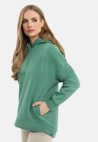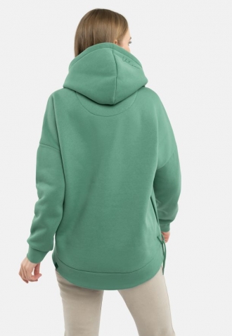 Pokud máte rádi oversize oblečení, mikinu B-SIGI si určitě zamilujete. Zelená barva přitahuje pozornost! Mikina má volný střih a oversize efekt navíc podtrhuje snížená linie ramen a prodloužená záda. Mikina má teplou a prostornou kapuci, díky čemuž je ideální pro chladnější dny. Je vyrobena z hřejivého fleecu, jehož vnitřek je podšitý měkkým, příjemným prachovým peřím.