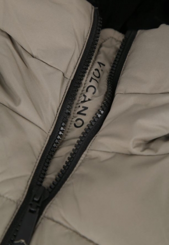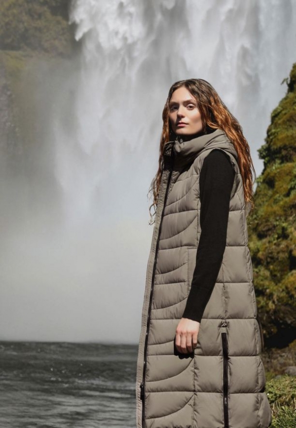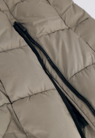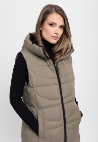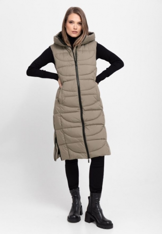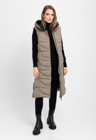 Tato dlouhá prošívaná dámská vesta v univerzálním béžovém odstínu je ideálním kouskem šatníku na přechodná roční období. Její střih účinně chrání před chladem a zároveň zajišťuje volnost pohybu. Prošívání opticky zeštíhluje postavu a kontrastní zip po celé délce vesty je praktickým a estetickým detailem. Model má pohodlnou kapuci, která dodatečně chrání před větrem a deštěm, a také rozparky po stranách, zvyšující komfort nošení a dodávající moderní charakter.