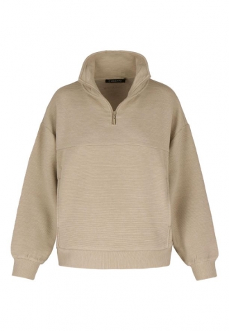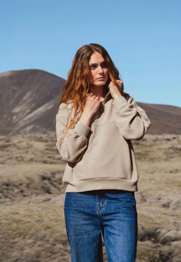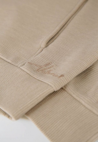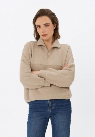 Béžová mikina je vyrobena z žebrované pleteniny s výraznou, vodorovnou strukturou a okouzluje svou texturou a měkkostí. Charakteristická pro tuto mikinu je vysoký stojáček se zipem, který umožňuje regulaci výstřihu, nabízí jak dodatečné teplo, tak i možnost vytvoření módního, casualového looku. Volný střih, se sníženou linií ramen a lemy na manžetách a na spodním lemu, zajišťuje maximální volnost pohybu a dokonalé přizpůsobení každé postavě, činíc ji ideálním návrhem pro každý den.