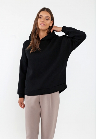 Pokud máte rádi oversized oblečení, mikinu B-SIGI si určitě zamilujete. Černá mikina má volný střih a oversize efekt navíc podtrhuje snížená linie ramen a prodloužená záda. Mikina má teplou a prostornou kapuci, díky čemuž je ideální pro chladnější dny. Je vyrobena z hřejivého fleecu, jehož vnitřek je podšitý měkkým, příjemným prachovým peřím.