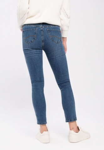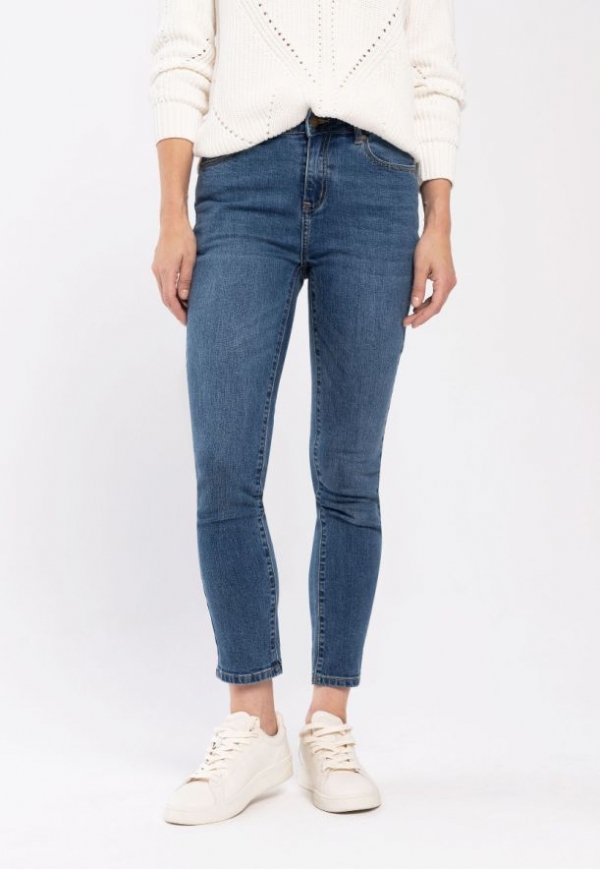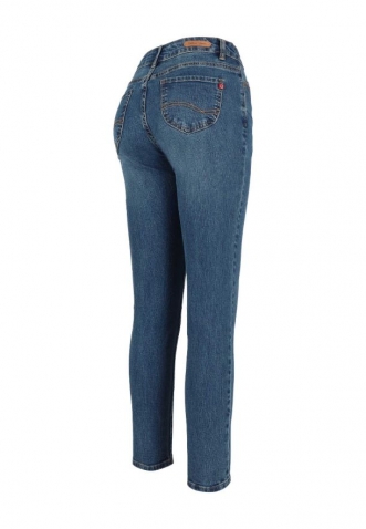 Kalhoty se středně vysokým/pravidelným sedem a vypasovanými nohavicemi. Nejuniverzálnější střih, ideální pro každou postavu. Přiléhavé kalhoty s plnou délkou dokonale tvarují siluetu a zdůrazňují tvarované nohy. Jsou vyrobeny z pružného džínového úpletu a jsou mimořádně pohodlné.