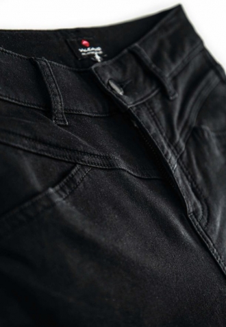 Dámské kalhoty Slim jsou celé černé. Černé jsou také doplňky a prošívání. Kalhoty mají sadu čtyř skutečných kapes. Ty vzadu jsou půlkulaté a pěkně zdůrazňují hýždě.