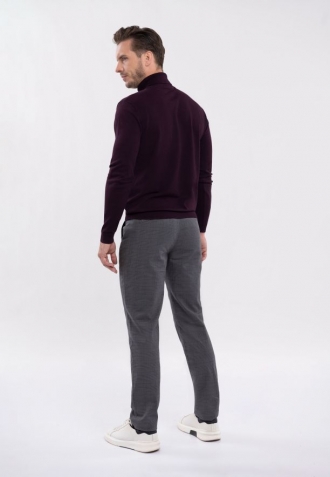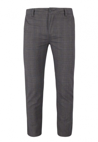 Pánské látkové kalhoty mají kostkovaný vzor a grafitovou barvu. Chinos kalhoty šité na míru mají dvě šikmé kapsy na přední straně a dvě kapsy na zadní straně, našité mírně šikmo. Zapínají se na zip a knoflík pro bezpečné zapínání a snadné používání. Poutka na opasek umožňují přizpůsobit styl přidáním oblíbeného pásku.