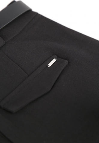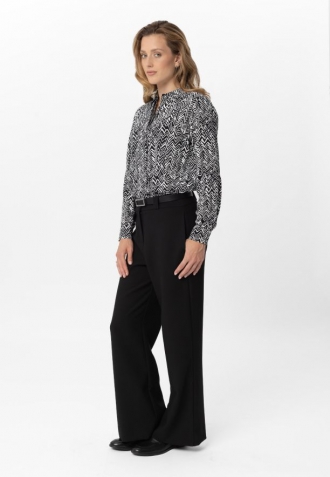 Kalhoty R-MILEN jsme ušili z tlustší, příjemné na dotek tkaniny. Taková tkanina v kombinaci s volným střihem dodává kalhotám noblesu a šik. Stojí za zmínku také to, že směs viskózy a polyesteru s elastanem způsobuje, že černé kalhoty jsou prodyšné, krásně sedí na postavě. Kalhoty můžete doplnit sakem JB-MIRELLA.