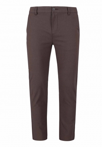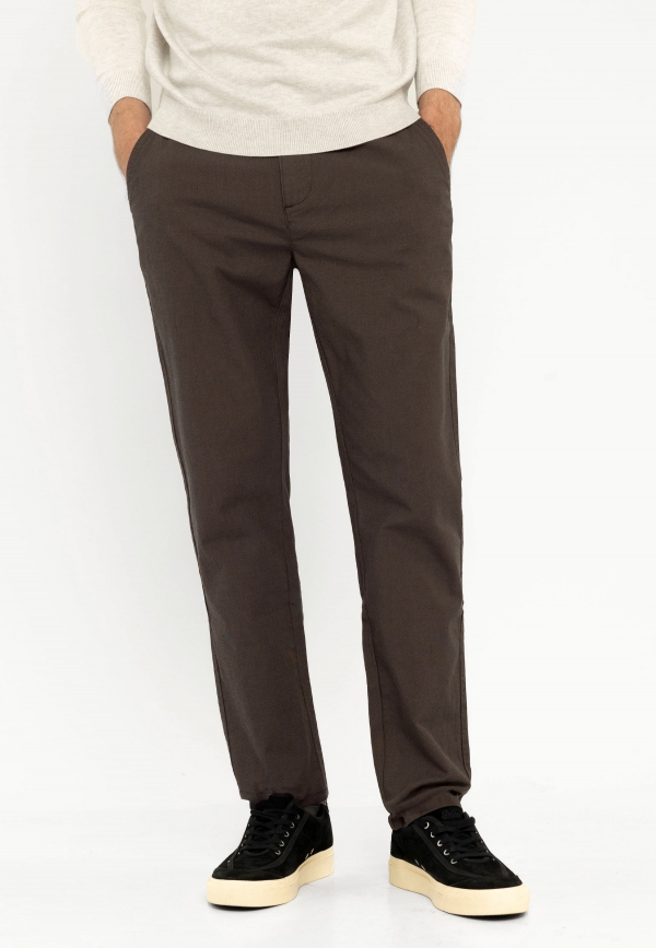 Zajímavým zpestřením kalhot je drobný vzor na materiálu. Hnědá barva se bude hodit prakticky ke každé košili, svetru nebo tričku. Díky klasické sadě kapes se kalhoty hodí do tradičního střihu chinos kalhot. Vepředu jsou dvě šikmé a vzadu jsou zapuštěné a zapínají se na knoflík.