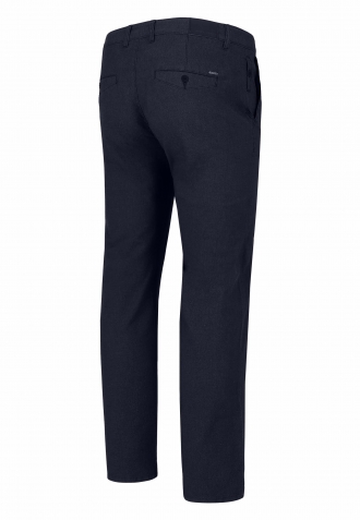 Zajímavým zpestřením kalhot je drobný vzor na materiálu. Modrá barva se bude hodit prakticky ke každé košili, svetru nebo tričku. Díky klasické sadě kapes se kalhoty hodí do tradičního střihu chinos kalhot. Vepředu jsou dvě šikmé a vzadu jsou zapuštěné a zapínají se na knoflík.