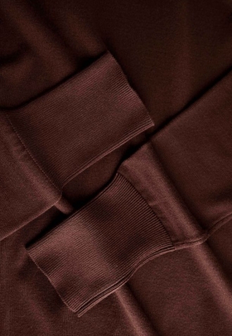 Hnědý rolákový svetr má vypasovaný střih a zvýrazňuje siluetu. Rukávy jsou zakončeny širokými žebrovanými manžetami. Celý střih je jednoduchý, elegantní a doplněný bižuterním detailem Volcano.