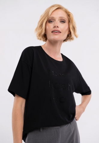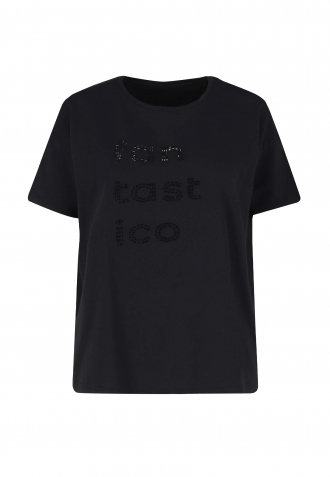 Dámské tričko T-FANTASTICO odlišuje černá barva a nápis s kamínky na přední straně. Nápis „Fantastico“ má stejnou barvu jako tričko, ale upozorňuje na sebe díky lesklým korálkům, které jsme zde použili.