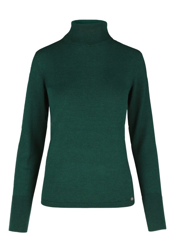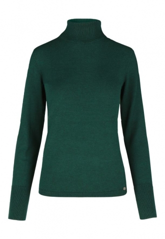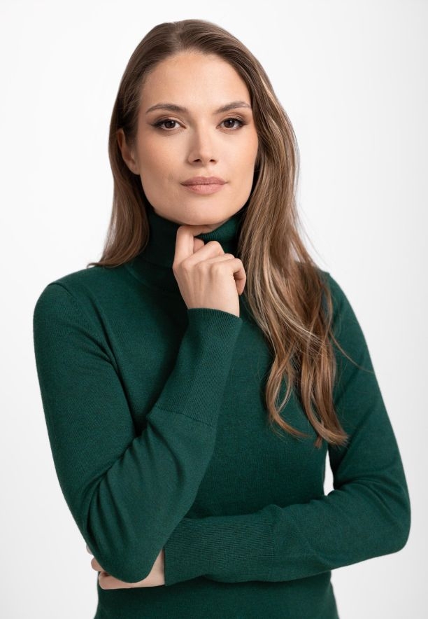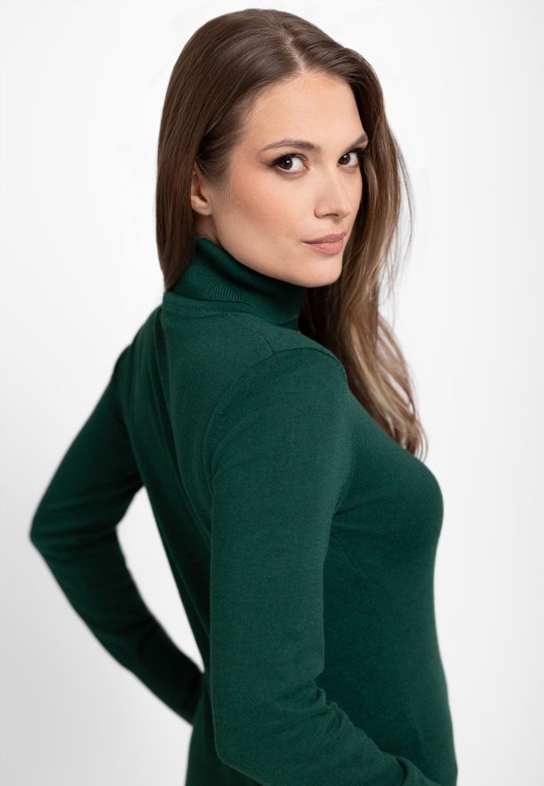Zelený svetr s rolákem má přiléhavý střih a podtrhuje postavu. Rukávy jsou zakončeny širokými, žebrovanými manžetami. Celý střih je jednoduchý, elegantní a doplněný bižuterním detailem Volcano.