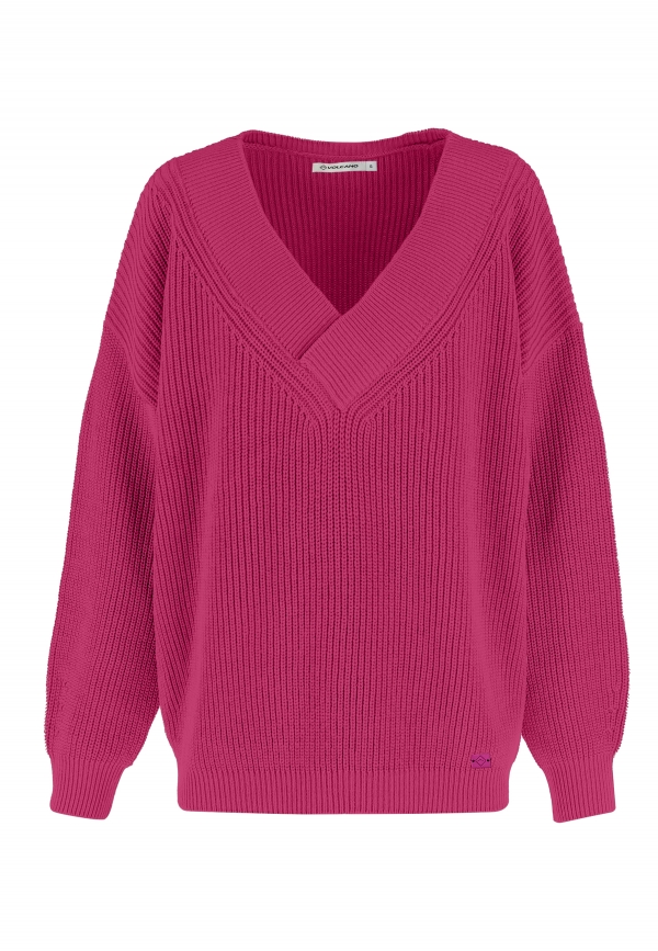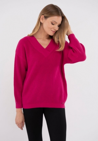 Dámský svetr S-VIDA se vyznačuje růžovou barvou, ale také sníženou linií ramen a širokými žebrovanými manžetami. Široký žebrovaný lem je zakončen výstřihem do V. Ten zvýrazňuje výstřih a pěkně odhaluje šperky. Rukávy a spodní část svetru jsou rovněž žebrované. Díky tomu svetr i přes svou nadměrnou velikost pěkně přiléhá k tělu a chrání před chladem.