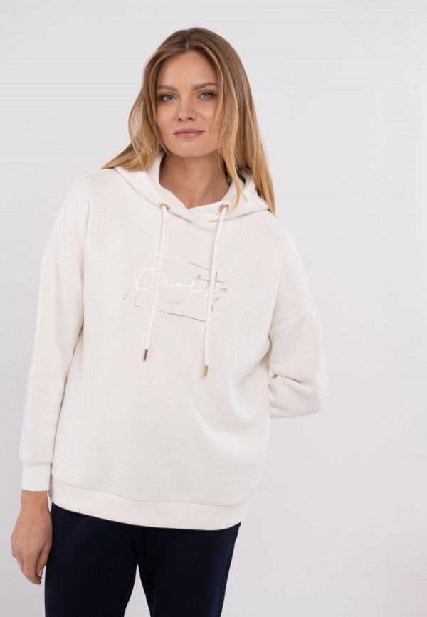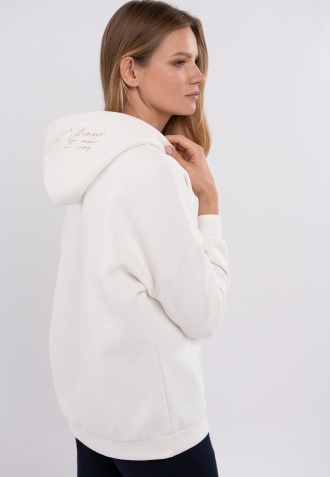 Mikinu krémové barvy zdobí lesklý potisk. Optimistický slogan najdete na přední straně mikiny, stejně jako na kapuci. Šňůrky na kapuci jsou zakončeny zlatou barvou. Konce šňůrek zdobí vyrytý nápis Volcano.