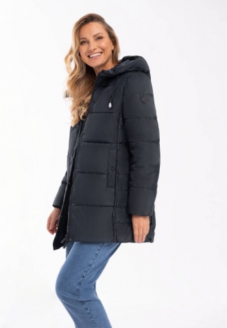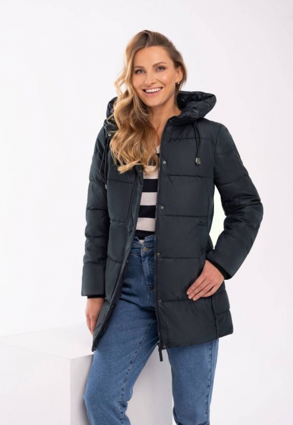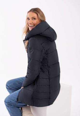 Dámský kabát J-PIRIN je v módní tmavě modré barvě. Rovný střih a spodní volný lem zajišťují volnost pohybu. Předností této dámské zimní bundy je také široká kapuce s lesklou vnitřní stranou. Velká kapuce se stahovacími šňůrkami poskytuje ochranu před proměnlivým počasím. Také zip krytý zapínacím proužkem a vnitřní manžetové lemy skvěle chrání před chladem a dělají z prošívaného kabátu J-PIRIN ideální volbu do zimních mrazů.