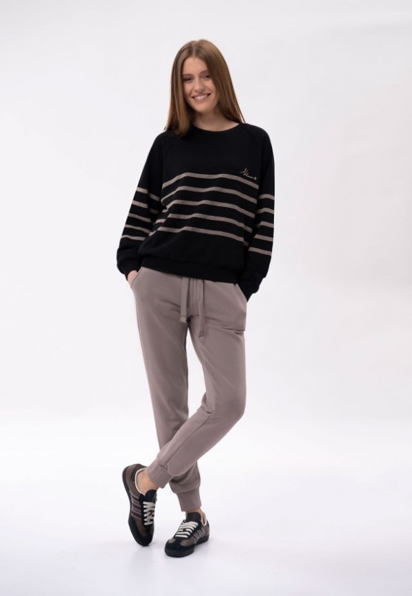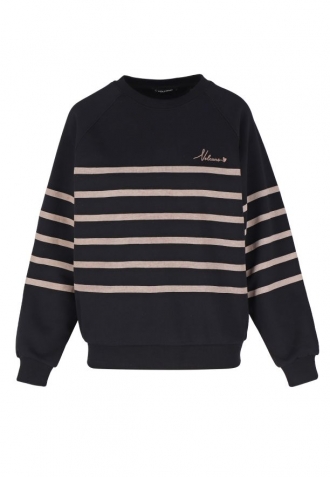 Černá pruhovaná dámská mikina je ušitá z měkké a odolné teplákoviny. Mikina se smyčkami zespodu zaručuje prodyšnost a zároveň hřejivost, díky čemuž je mikina ideální pro každodenní nošení. Díky volnému střihu a raglánovým rukávům poskytuje tato módní dámská mikina plný komfort pohybu. Díky kulatému výstřihu a žebrovaným manžetám dámská mikina B-MUSE perfektně sedí na těle.