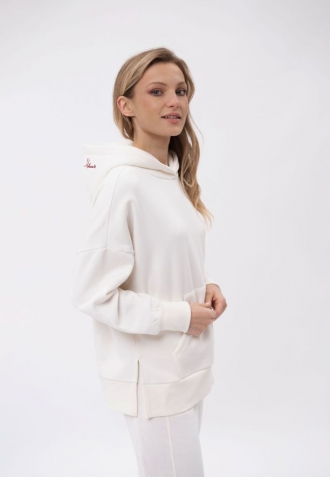 B-LOVE je dámská mikina s oversize střihem. Tato módní mikina je v krásné bílé barvě a zespodu má nadýchaný povrch. Díky tomu je hřejivá a příjemná na dotek. Je vyrobena z bavlny s polyesterem, takže poskytuje pohodlí a v kombinaci se sníženou linií ramen také volnost pohybu.