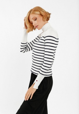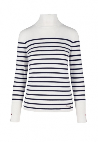Dámský bílo-námořnický pruhovaný rolák je stylovou volbou pro chladnější dny. Je vyroben z pružného úpletu a dokonale se přizpůsobí siluetě pro pohodlné celodenní nošení. Žebrovaný rolák působí klasickým dojmem, zatímco vypasovaný střih zvýrazní přednosti postavy.