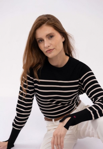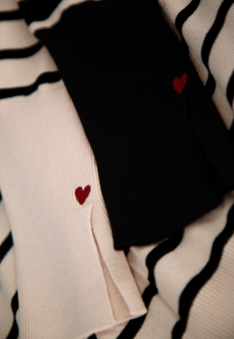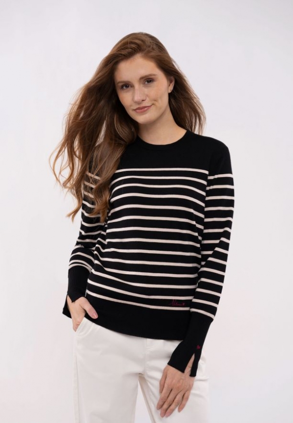 Černý svetr S-KOMI zdobí klasický pruhovaný vzor a vyšité logo Volcano. Ve výstřihu, na spodním lemu a na manžetách rukávů jsou žebrované manžety svetru, které dokonale padnou. Na manžetách jsou ozdobné rozparky zakončené vyšívaným srdcem, které vnášejí jemný, ženský nádech.
