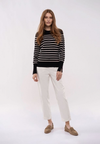 Svetr klasického pohodlného střihu s pruhovaným vzorem? Ano, to je vždy osvědčená volba. Dámský pruhovaný svetr S-KOMI je ušitý z měkké, na dotek příjemné směsi viskózy a polyesteru. Díky tomu v něm může pokožka dýchat, zatímco samotný svetr se nevytahuje a příjemně sedí na těle. Díky klasickému střihu a půlkruhovému výstřihu se svetr hodí k mnoha outfitům.