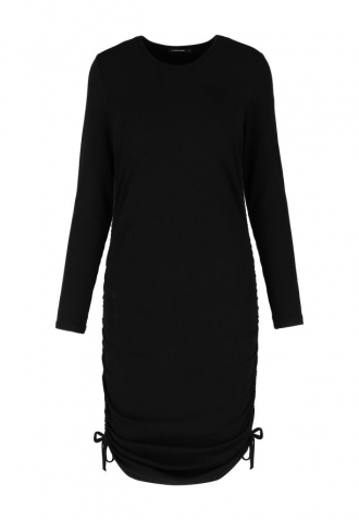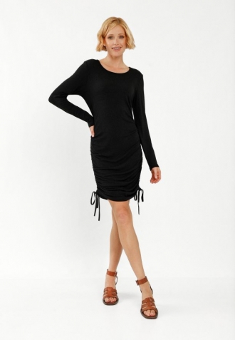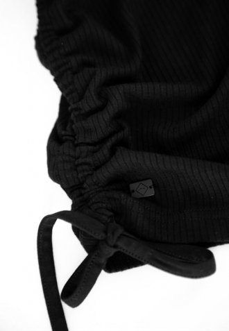 Tyto elegantní černé šaty jsou ideální volbou pro ženy, které oceňují minimalismus a promyšlený šatník. Šaty lze totiž nosit dvěma způsoby, od malých černých až po elegantnější maxi šaty. Je to díky páskům všitým do boků, které umožňují upravit délku. Jsou vyrobeny z pružného, měkkého úpletu, dokonale se přizpůsobí postavě a zdůrazní její přednosti. Šaty se vyznačují svislými úzkými pruhy, které opticky zeštíhlují postavu. Polokulatý výstřih, volné manžety a spodní lem jim dodávají lehce ležérní charakter, který se skvěle hodí pro každodenní nošení i pro zvláštní příležitosti.