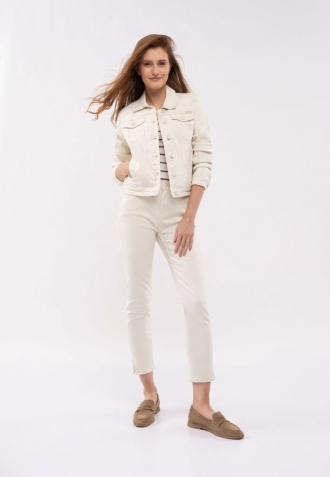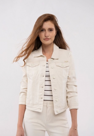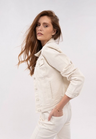 Klasická dámská džínová bunda v novém vzhledu. Bunda J-NALA je vypasovaná krátká džínová bunda v krémové barvě. Je to džínová bunda v základním stylu se zapínáním na knoflíky, náprsními kapsami a dvěma nakládanými kapsami na boku.