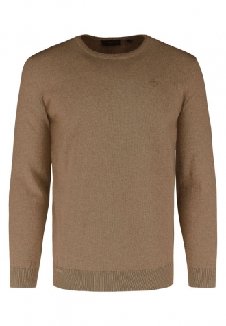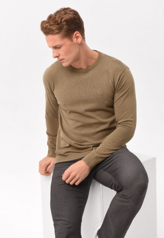 Svetr S-RADO má béžovou barvu a je hladký. Jednoduchý design je zpestřen vyšitým detailem loga značky na levé straně.