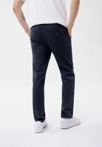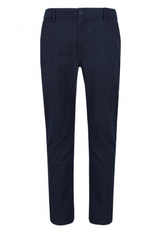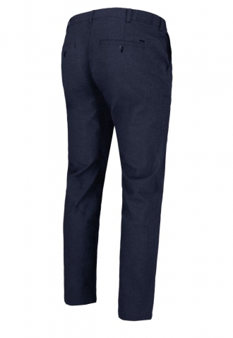 Tyto pánské látkové kalhoty se vyznačují praktickými detaily - třemi předními kapsami a dvěma zadními kapsami, které jim dodávají na funkčnosti. Díky elastanu použitému v tkanině kalhoty dokonale přiléhají k tělu a zároveň si déle zachovávají svůj tvar a odolnost. Tmavě modrý odstín kalhot umožňuje jejich snadné kombinování s různými vrchními díly oblečení, a vytváří tak elegantní a zároveň pohodlný vzhled pro každou příležitost.
