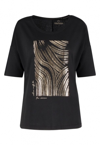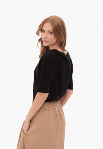 Tričko oversize v černé barvě se vyznačuje sníženou linií ramen a půlkruhovým výstřihem, který zdůrazňuje krk. Abstraktní potisk na hrudi, dodává umělecký nádech. Jedná se o model, který se bude dobře hodit k džínům, šortkám nebo sukním, čímž vytvoří ležérní a moderní styling. Ideální volba pro ženy, které ocení pohodlí a originální detaily.