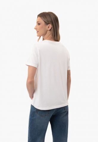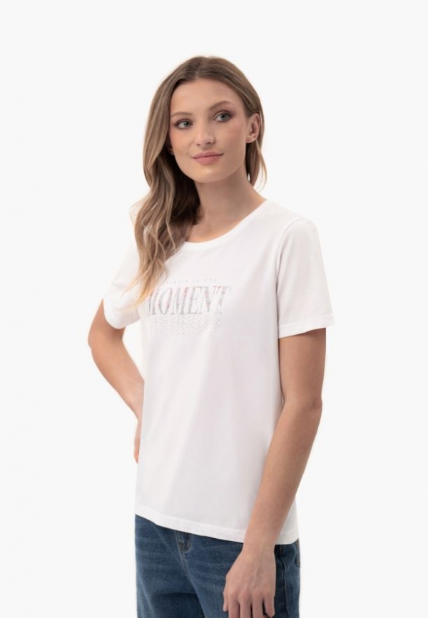Tričko T-MOMENTS má na hrudi lesklý potisk, který na sebe upozorňuje a zdůrazňuje jeho charakter. Díky krátkým rukávům a volnému rovnému lemu se hodí k různým stylům od džínů po sukně. Doplňkem je ozdobná stuha na vnitřní straně límce, která zdůrazňuje smysl pro detail. Je ideální volbou pro ženy, které ocení pohodlí a nadčasový styl s nádechem půvabu.