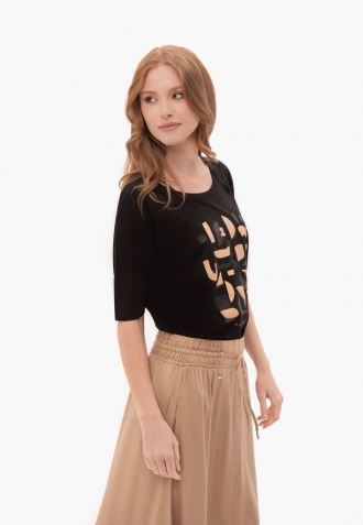 Dámské tričko pohodlného střihu má černou barvu a abstraktní potisk na hrudi, který dodává tomuto dámskému tričku jedinečný charakter.