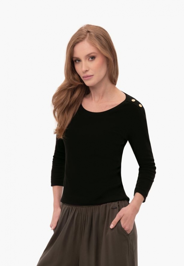 Toto dámské tričko s 3/4 rukávem je vyrobeno z žebrované tkaniny. Jedná se o bavlnu s elastanem, díky které je tento dámský top s dlouhým rukávem prodyšný a přiléhá k tělu. Tričko má černou barvu, takže se hodí téměř ke každé stylizaci. Blůzu ozvláštňuje decentní detail dvou měděných knoflíků na levém rameni.