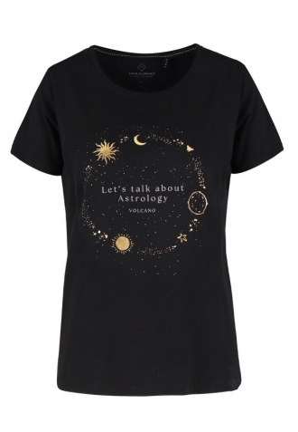 Dámské tričko T-ASTRO v černé barvě je návrh pro milovnice originálních astrologických motivů. Jeho kosmický potisk ve zlatých odstínech upoutá pozornost a dodá outfitu jedinečný charakter. Vyrobené z 95% bavlny a 5% elastanu s gramáží 200 GSM, zajišťuje plné pohodlí při nošení. Střih Regular Fit zajišťuje volné přizpůsobení a tričko vypadá skvěle jak s džínami, tak se sukní. Dostupné ve velikostech od XS do XXL, představuje originální prvek každodenních outfitů, který zdůrazní váš módní a originální vzhled.