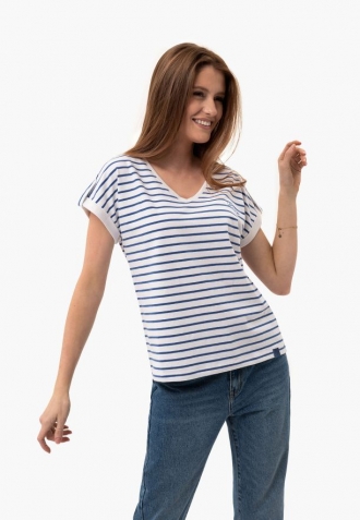 Ležérní styling nevylučuje efektní řešení! Dámské pruhované tričko T-PORTO se hodí ke kalhotám i sukním. Střih Comfort Fit, kimonové rukávy a hluboký výstřih dodávají tričku T-PORTO originální nádech. Jemné písmo v nápisu „Volcano“ na hrudi ladí se stylem trička.