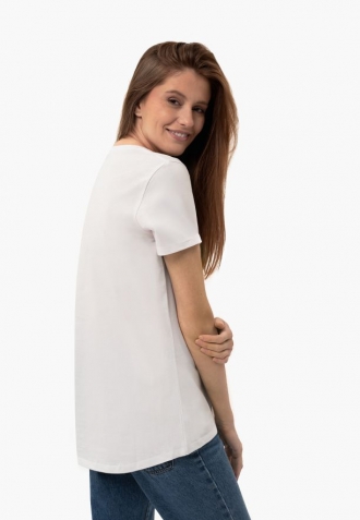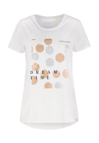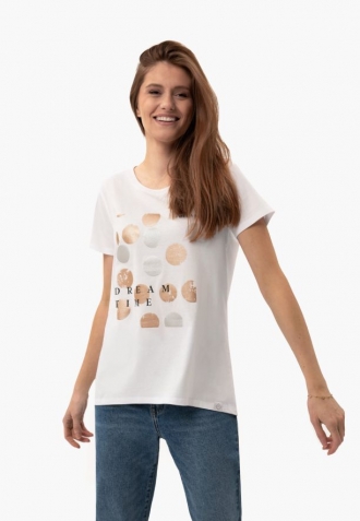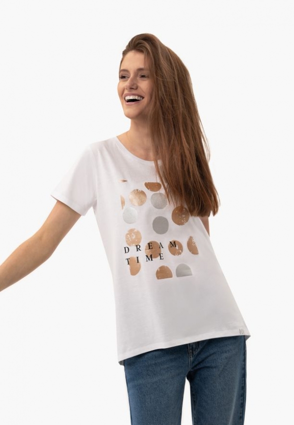 Dámské tričko má na hrudi potisk ve stylu glamour. Ozdobné potisky v podobě kruhů v odstínech zlaté a stříbrné a nápis „DREAM TIME“ upoutají pozornost a dodávají halence originální charakter. Jemné, lesklé prvky jí dodávají trochu elegance, díky čemuž můžete tričko T-NETTA kombinovat nejen s klasickými džínami, ale také s ženskými sukněmi. Univerzální bílá barva usnadňuje kombinování s různými stylizacemi: jak pro každodenní nošení, tak pro neformální setkání s přáteli.