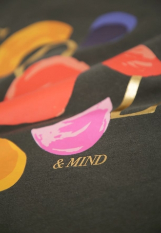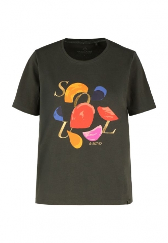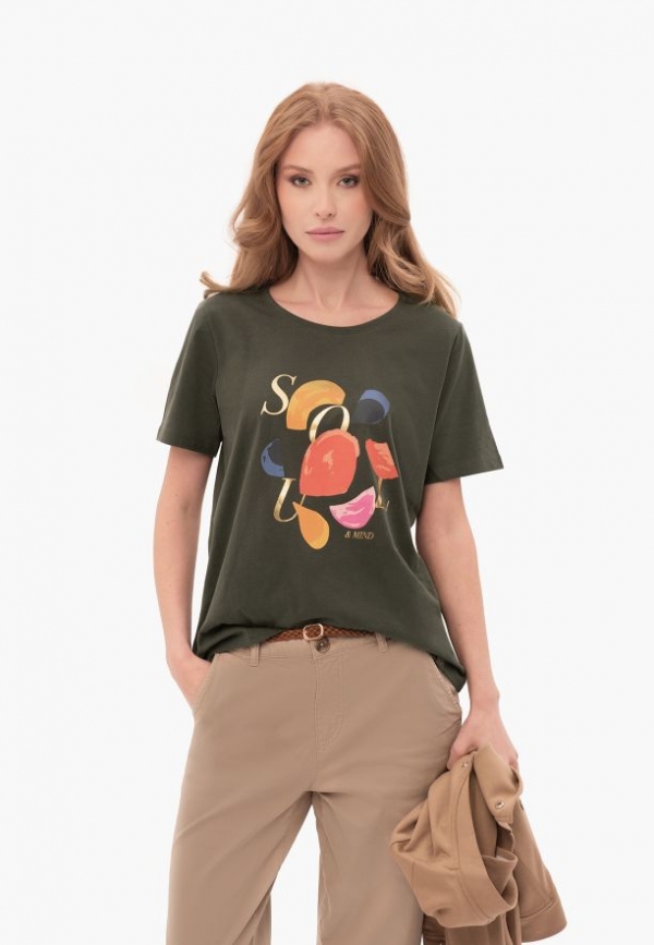Co odlišuje tričko T-SOUL je barevný potisk na hrudi. Udržovaný v letních, zlatavě oranžových barvách se ideálně hodí k zelené barvě, která tvoří základ tohoto dámského trička.