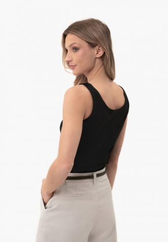 Klasický dámský top v černé barvě je ideálním základem pro mnoho outfitů. Je výrazný svým jednolitým odstínem a jemně žebrovanou strukturou. Je nadčasovým řešením, které rychle nevyjde z módy. Dámský top vypadá skvěle v létě s šortkami a také v zimě jako základ pod košili, svetr nebo kardigan.