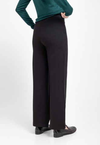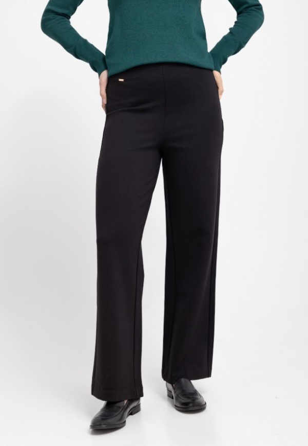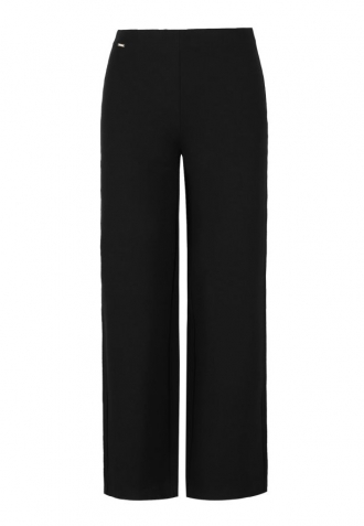 Dámské kalhoty v černé barvě R-ESTA mají střih Comfort Fit. Vyznačují se širokou, volnou a delší nohavicí bez lemů, díky čemuž se pěkně skládají na postavě. Dámské kalhoty mají elastický pas a sklady vzadu, což zaručuje ideální přizpůsobení postavě. V kombinaci s elastickým materiálem typu pěna zajišťují plnou volnost pohybu a pohodlí po celý den.
