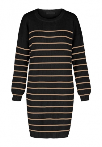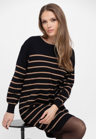 Pletené šaty G-SENTI se stanou vaší oblíbenou každodenní volbou, zajišťující příjemné obepnutí v chladnějších dnech. Charakteristickým rysem těchto šatů je nadčasový vzor s klasickými vodorovnými pruhy. Tento námořnický akcent jim dodává svěžest a eleganci, která nikdy nevyjde z módy. Volný střih s dlouhým rukávem a kulatým výstřihem zajišťuje komfort a univerzálnost, a pletenina obepíná tělo, což dává pocit útulnosti.