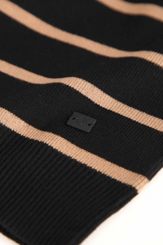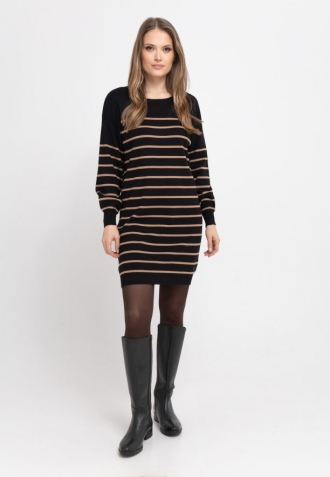 Teplé, černé šaty s pruhy jsou vyrobeny z příjemné na dotek směsi viskózy a polyamidu. Díky obsahu viskózy je materiál výjimečně měkký, hedvábný na dotek a krásně se ukládá, decentně obepínajíc postavu a zároveň zajišťujíc vynikající prodyšnost. Přídavek polyamidu zase zaručuje trvanlivost, odolnost proti mačkání a skvělé udržení střihu i po mnoha praních. Tyto pletené šaty jsou vynikající volbou pro chladnější dny, ideální pro nošení samostatně s kotníčkovými botami nebo teniskami, a také jako základ pod svetr, kardigan nebo ramonesku. Vytvořte s nimi nespočet stylových a pohodlných stylizací, užívajíc si jejich útulný charakter!