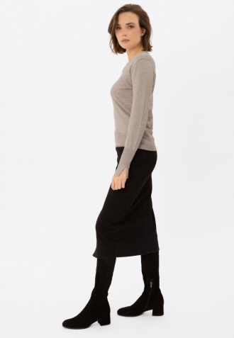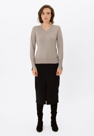 Svetr S-NELI, vyrobený z hladkého úpletu, zaujme jednoduchým, ale zároveň stylovým designem. Jeho přiléhavý střih Slim Fit podtrhuje ženské tvary a výstřih do V mu dodává jemnost a ženský šarm. Zakončení na manžetách a spodním lemu širokými žebrovanými manžetami zajišťuje nejen dokonalé přizpůsobení, ale také odolnost, díky čemuž se z něj budete těšit mnoho sezón. Je třeba zdůraznit, že manžety mají jemné, ozdobné rozparky a béžový svetr s výstřihem do V je k dispozici také ve velkých velikostech.