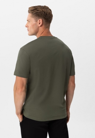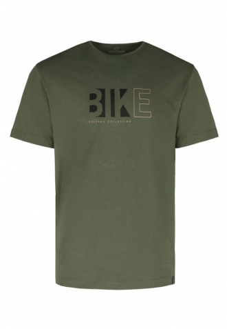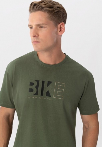 Pánské tričko s krátkým rukávem má potisk na hrudi. Sloganem "bike" odkazuje na kola a určitě se zalíbí milovníkům jízdy na kole. Minimalistický potisk se ideálně kombinuje s tričkem v barvě khaki.