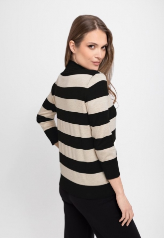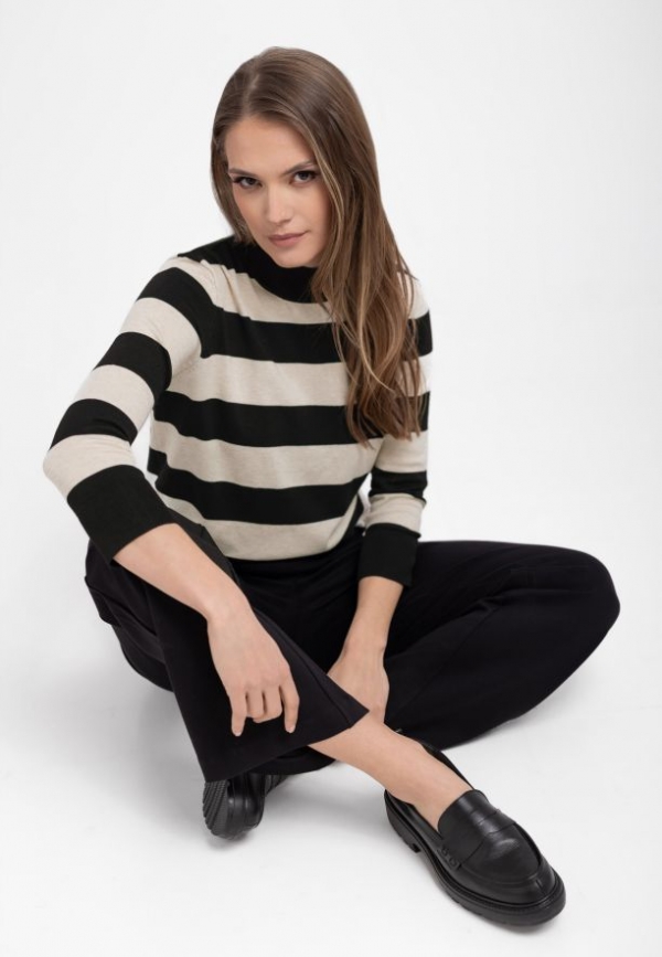 Vlastností odlišující svetr S-TESS jsou široké béžovo - černé pruhy. Široké, žebrované lemy u manžet a na spodním lemu mu nejen dodávají charakter, ale také zajišťují dokonalé přizpůsobení a trvanlivost. A klasický střih způsobuje, že bude sedět na každou postavu.