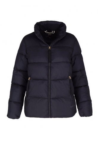 Tmavě modrá bunda má zlaté dekorativní prvky, široké prošívání a výplň z lehkého a nadýchaného termoizolačního vlákna z polyesteru. To zaručuje optimální teplo bez zbytečného zatížení, což činí bundu mimořádně pohodlnou na nošení. Vysoký límec dodatečně chrání krk před chladem, a praktické kapsy umožňují uložení drobných předmětů. Je to spolehlivý prvek šatníku, který se osvědčí jak při městských procházkách, tak i o víkendových výletech.
