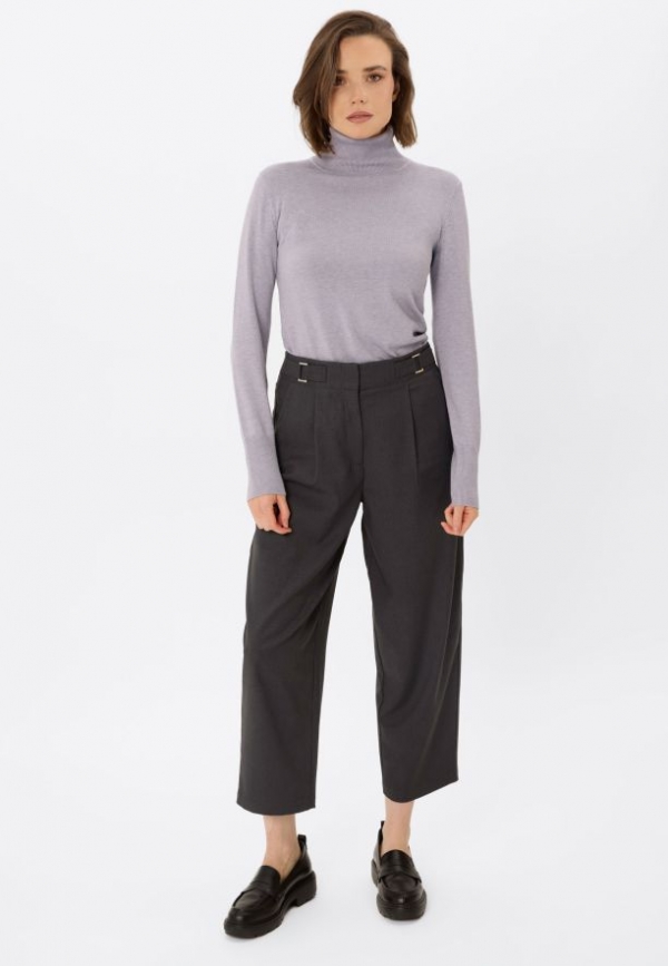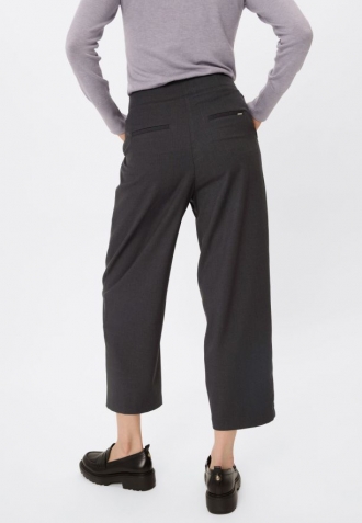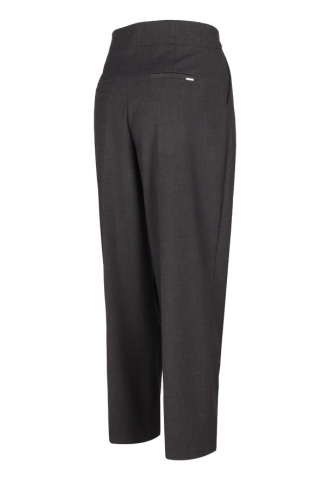 Kalhoty R-ISUMA jsou modelem kalhot v grafitové barvě, vyznačující se smart casual střihem s moderním akcentem. Jejich střih se vyznačuje vysokým pasem a objemnými nohavicemi, které se směrem dolů jemně zužují, čímž vytváří módní efekt "mrkve" nebo "tapered". Výrazné záševky vpředu na kalhotách jim dodávají strukturu a eleganci a zároveň zajišťují pohodlí nošení a volnost pohybu.