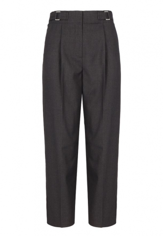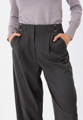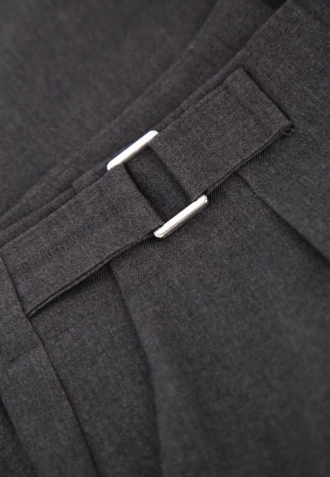 Grafitové látkové kalhoty mají širší pas a tvoří nedílnou součást konstrukce, což podtrhuje linii pasu. Jejich výjimečnost zdůrazňují dvě kovové, obdélníkové přezky, umístěné symetricky po stranách. Tyto minimalistické přezky plní ozdobnou funkci a dodávají kalhotám jedinečný, moderní charakter. Kombinace grafitovébarvy s moderními detaily činí kalhoty R-ISUMA ideální volbou jak pro kancelářské stylizace, tak pro elegantní soupravy pro speciální příležitosti, a také pro ležérnější, ale stále šik vzhled.